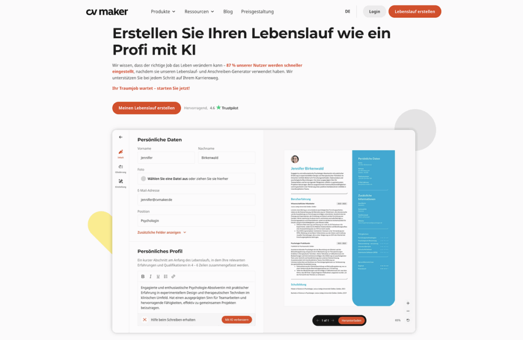 CVmaker.de belegt in unserem Vergleich den ersten Platz – und das aus gutem Grund. Dieser Online-Lebenslauf-Generator ist mehr als nur ein einfacher CV-Editor. CVmaker bietet eine umfassende Karriereplattform, die über das bloße Erstellen deines Lebenslaufs hinausgeht.