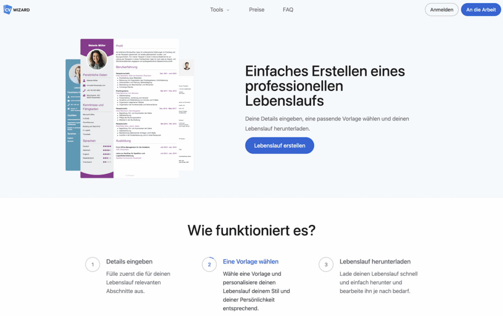 Auf Platz 2 schafft es CVwizard.com, ein weiterer beliebter Online-CV-Generator. Die Seite trägt „Wizard“ (also Zauberer) im Namen – und tatsächlich gelingt es mit diesem Tool fast wie von Zauberhand, einen fertigen Lebenslauf zu erstellen. CVwizard bietet einen ähnlichen Funktionsumfang wie CVmaker und richtet sich an Bewerber, die ebenfalls Wert auf Professionalität und Zusatzfunktionen legen.