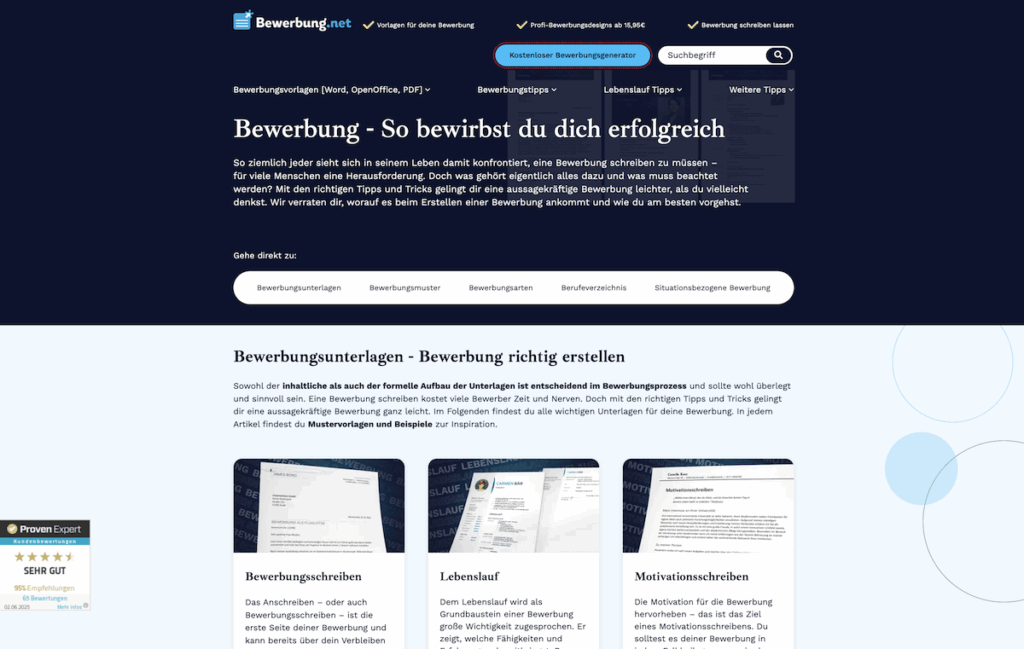 In unserem Ranking steht Bewerbung.net auf Platz 4, weil der Fokus der Seite eher auf Informationsvermittlung liegt und der Lebenslauf-Editor ein schlankes Zusatzangebot ist. Für eine schnelle, solide Bewerbung ohne Kosten ist dieses Angebot jedoch hervorragend. Insbesondere wenn du ohnehin Rat zum Thema Bewerbung suchst, bist du hier an der richtigen Adresse.