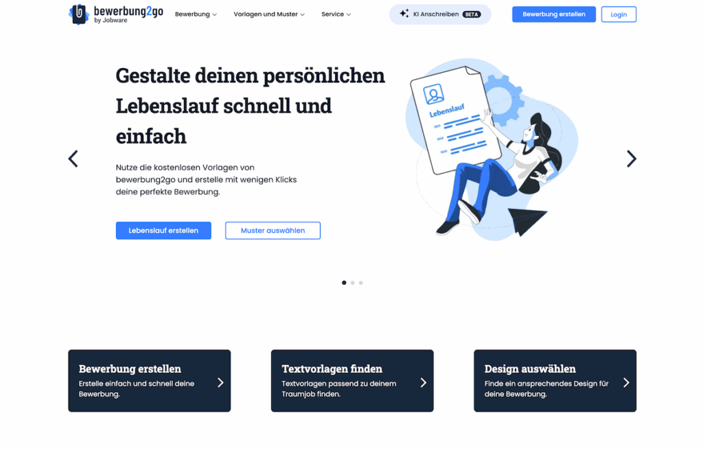Wenn du auf der Suche nach einer kostenlosen Möglichkeit bist, deinen Lebenslauf online zu erstellen, solltest du Bewerbung2Go.de unbedingt ausprobieren. Dieser Dienst – bereitgestellt von der renommierten Jobbörse Jobware – nennt sich selbst der „Bewerberglücklichmacher“. Tatsächlich bietet Bewerbung2go jede Menge nützliche Funktionen, ohne dass du dafür tief in die Tasche greifen musst.